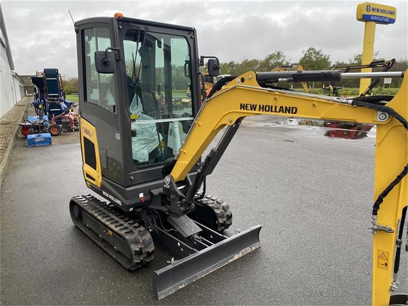 Fabriksny New Holland E22D CAB AG minigraver. . Kompakt og stærk minigraver med flg. data. 20,6 hk, 2190 kg, udskydelig 990 - 1300, 2,56-2,76 meter gravedybde, olieudtag i joystick.